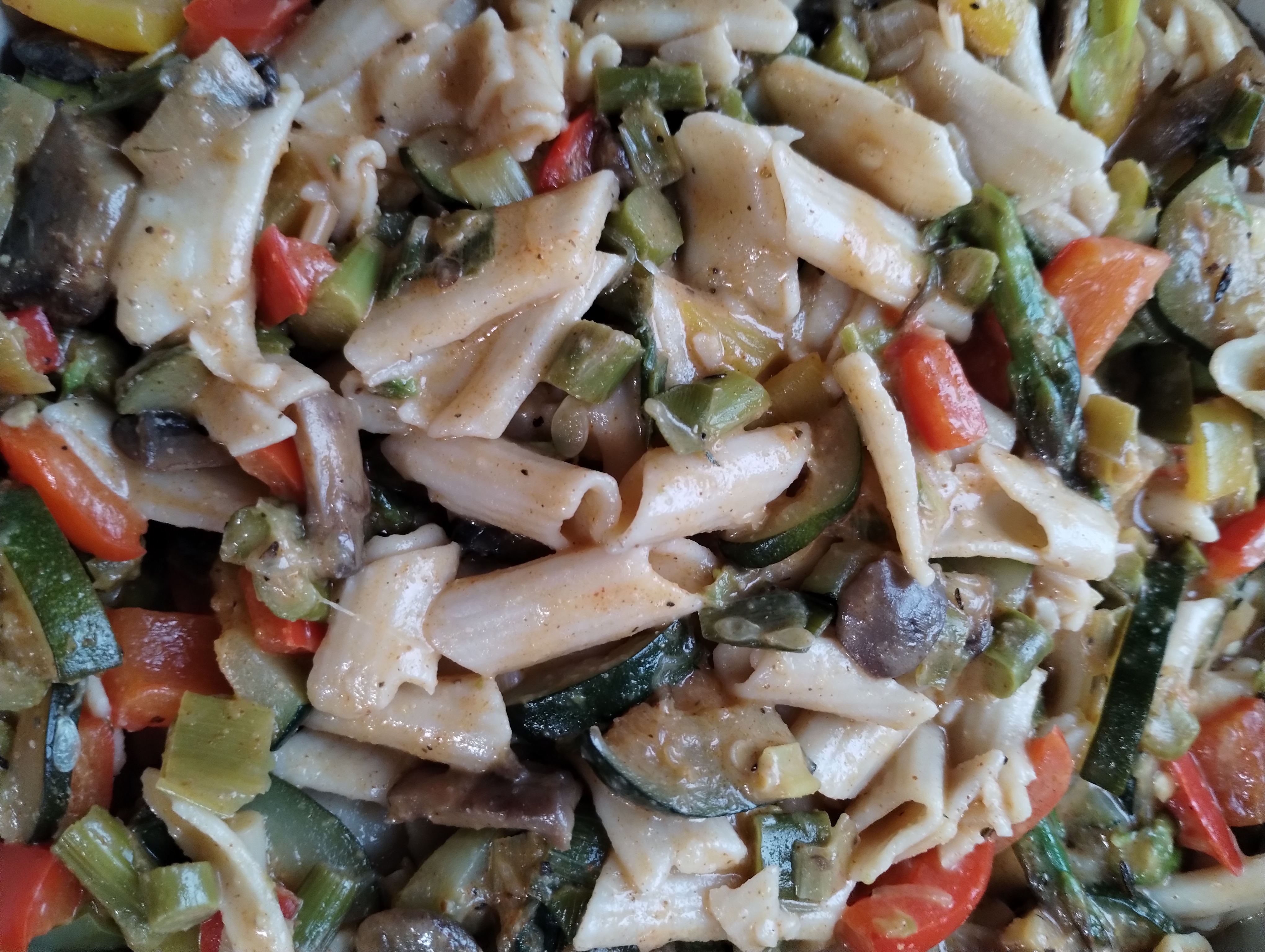 creamy cajun veggie pasta close up with penne pasta, red peppers, zucchini, asparagus, mushrooms, and green onions
