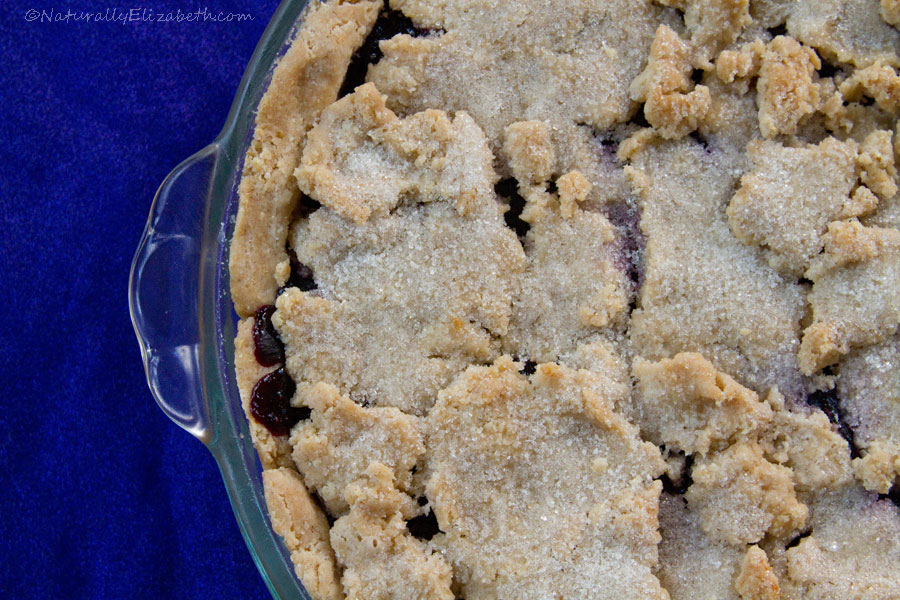 Pour the filling into the bottom pie crust. Using your hands, flatten out the reserved dough and make a mosaic of pie crust on top of the filling, covering as completely as possible. Sprinkle with the remaining sugar.